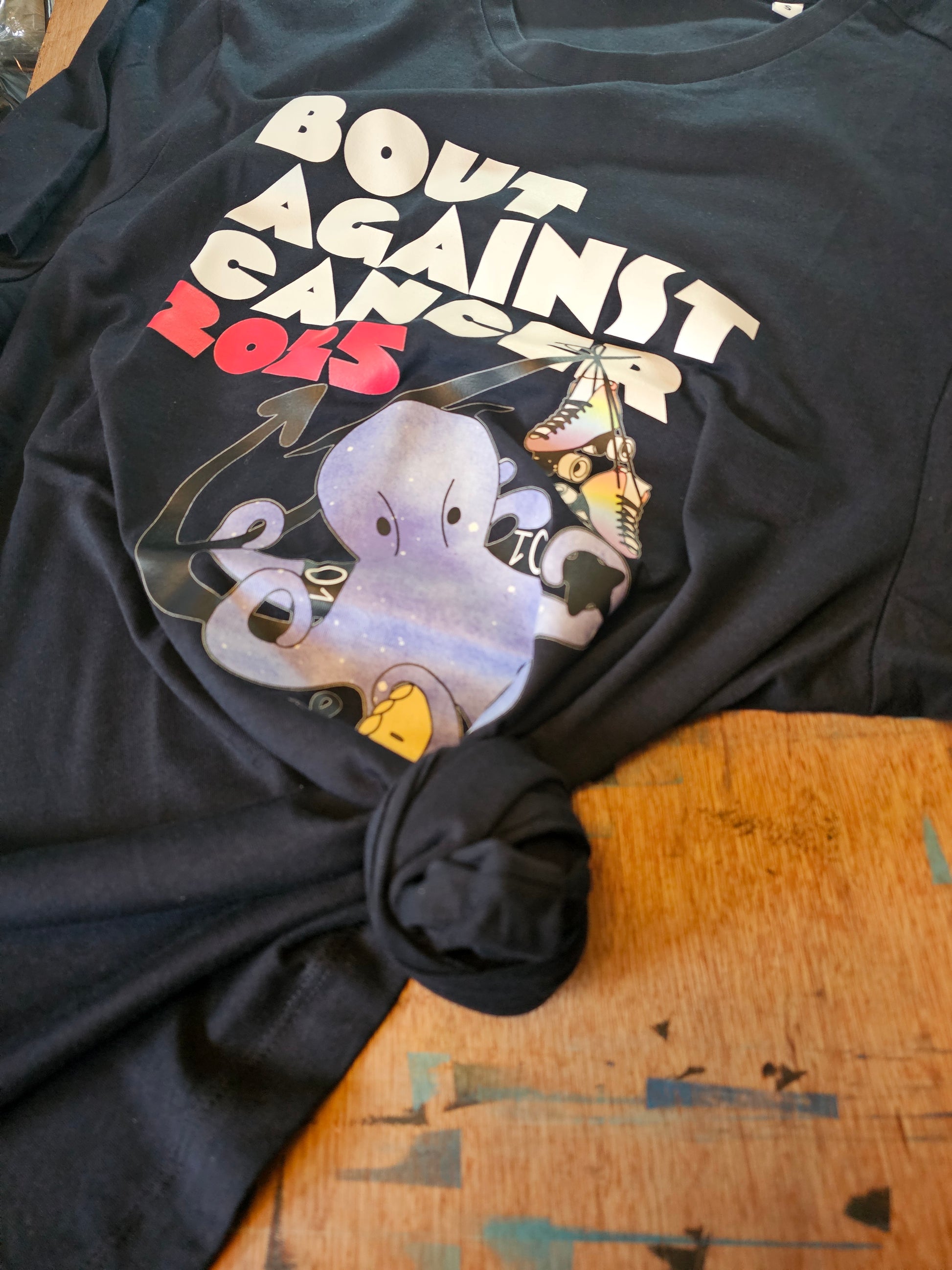 The softest cotton navy tee shirt featuring this years Bout Against Cancer octopus logo. Available for week only.